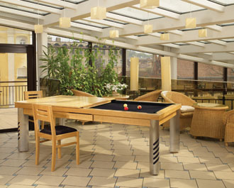 Along with the four-star accommodations at the Hotel Daugirdas, guests can enjoy this pair of dinner-pool conversion tables, with one in the lobby bar area (top photo) and the other in the terrace (bottom photo). While the setting and lighting appear to be unconventional, both areas offer a cool, contemporary spot to shoot a game or two, should you ever find yourself in central Lithuania.