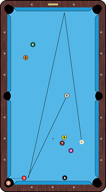 The final score was the final score—and this month's Stroke of Genius shows just why that end result was the conclusion. After trading safeties in a doubles match with Team Europe's Joshua Filler and Moritz Neuhausen facing Team USA's Fedor Gorst and Skyler Woodward, Filler faced the situation shown in the diagram. After Gorst rattled the 3 in the lower left corner, Team Europe had an angle on the object ball, but position on the 4 was hardly natural.