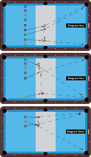 I like to start with the 7 ball (Diagram One) and play a soft kill shot with a little angle to come across, while already thinking about the angle I will need to leave for shot three. Always look three shots ahead.